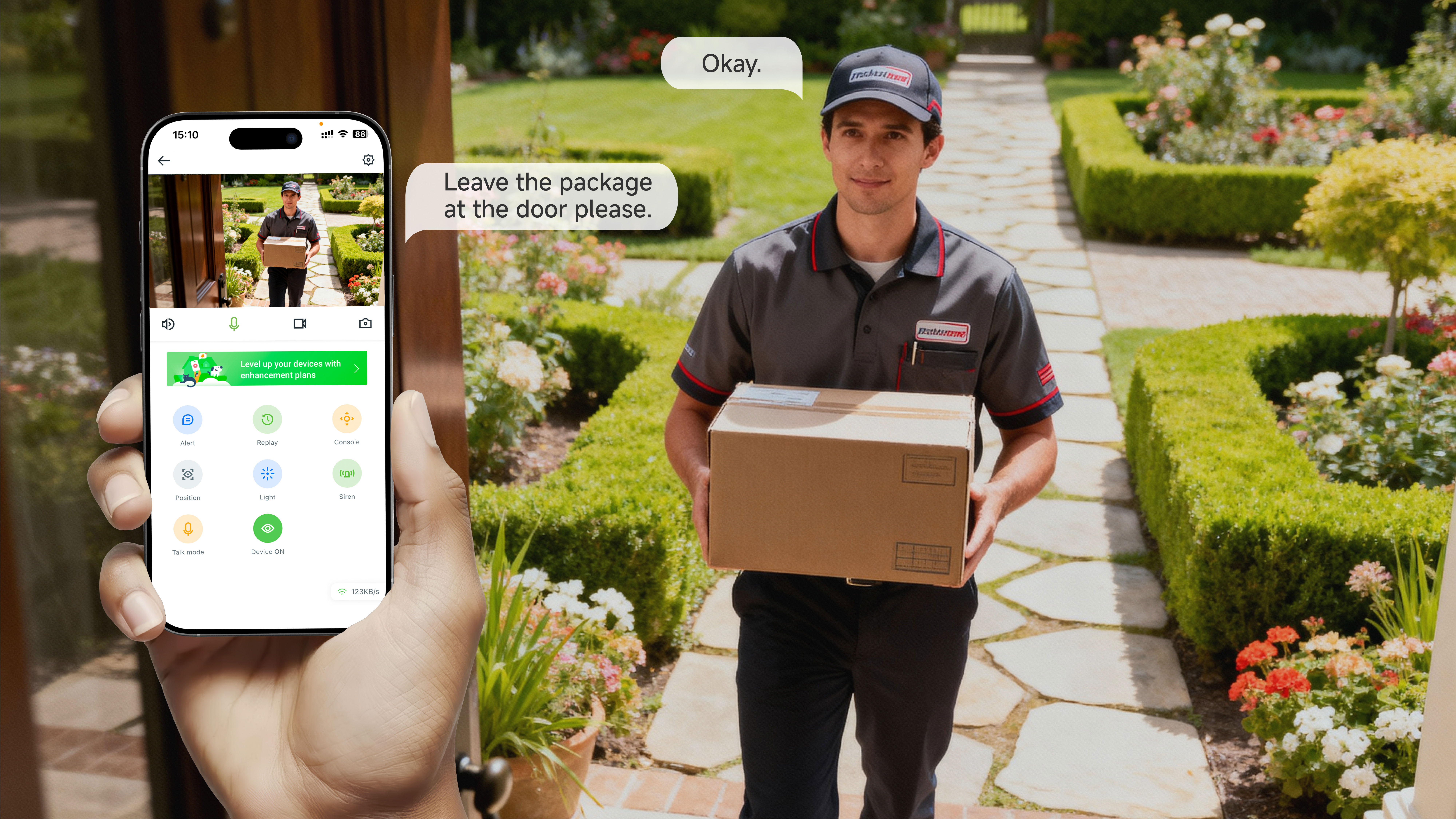 Supports real-time two-way audio, allowing you to easily communicate with family members or visitors anytime, anywhere.